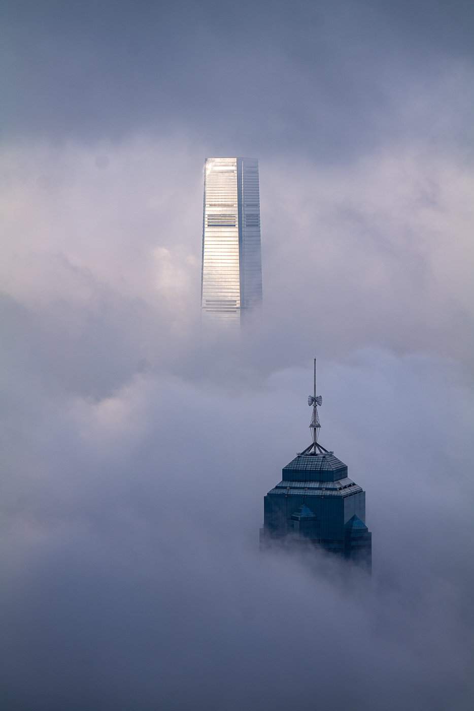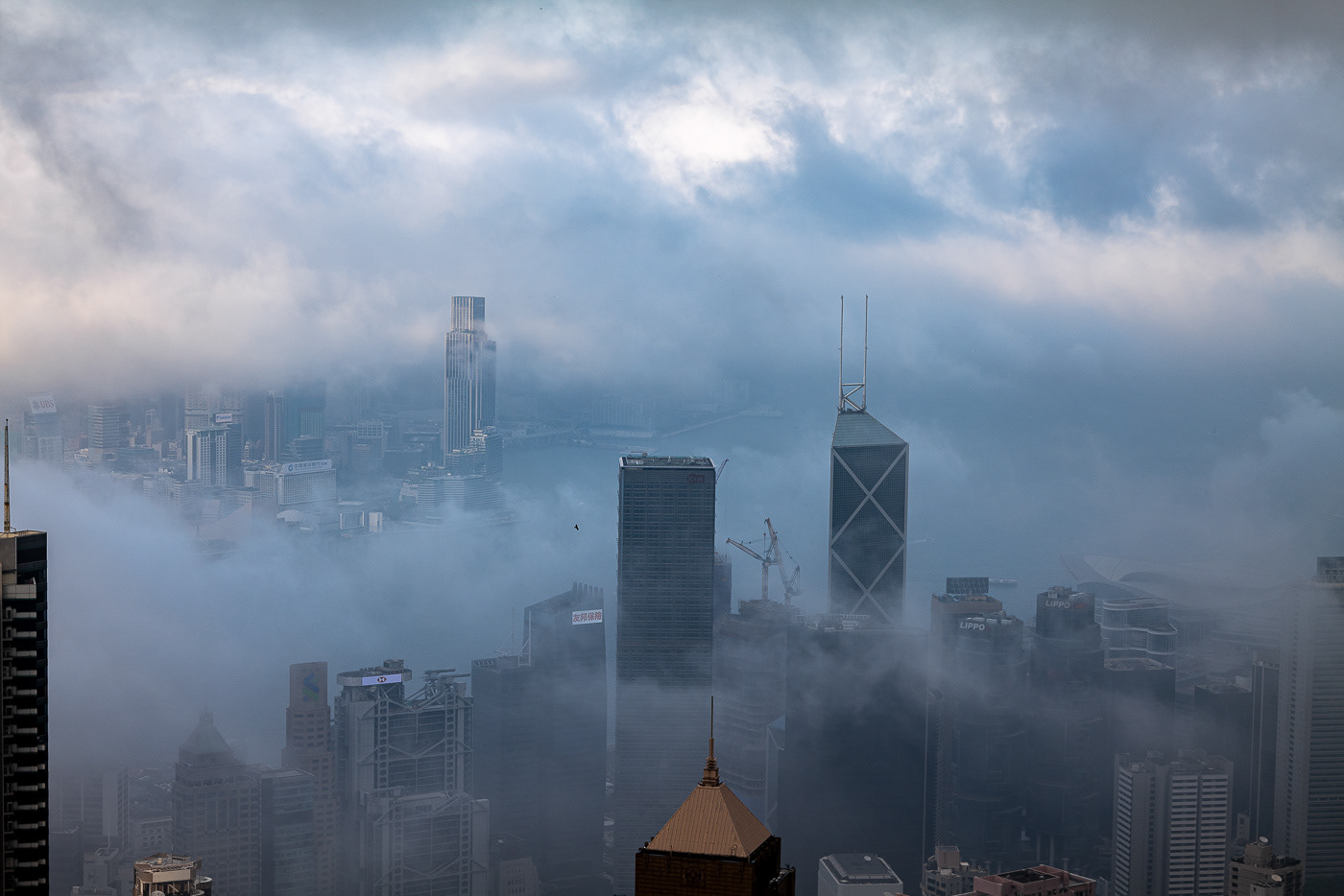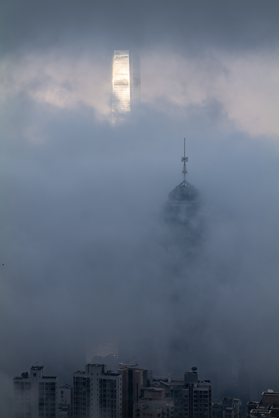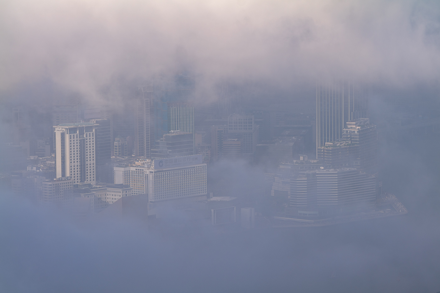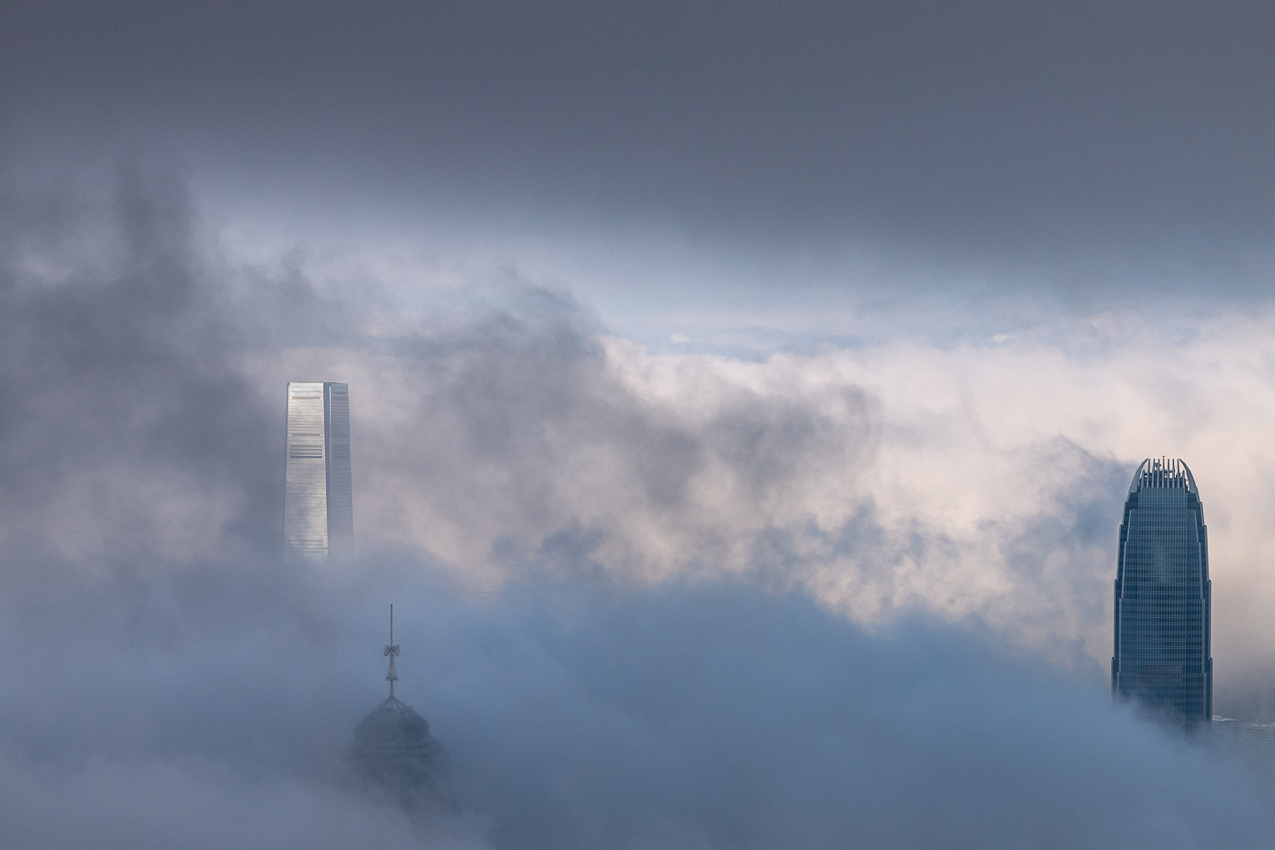 A thick layer of fog blanketed the harbour and cityscape on both sides in Victoria Harbour, Hong Kong in early February. A cool humid coastal airstream from the East raised humidity levels to 90% and brought in the fog, while weak sunlight and the surrounding hills prevented it from dissipating, covering the buildings during the day. This layer was below the observation point of around 500m altitude on Victoria Peak.