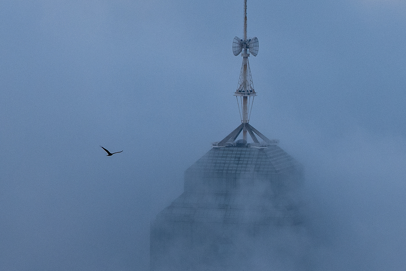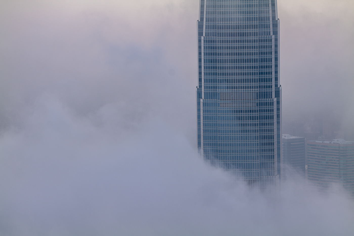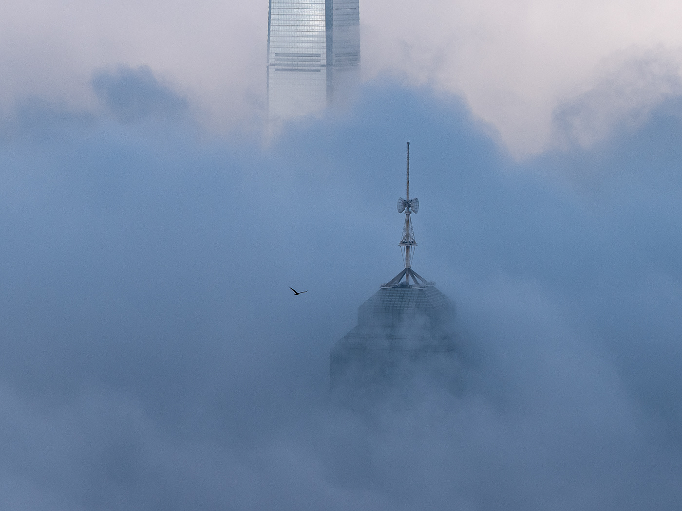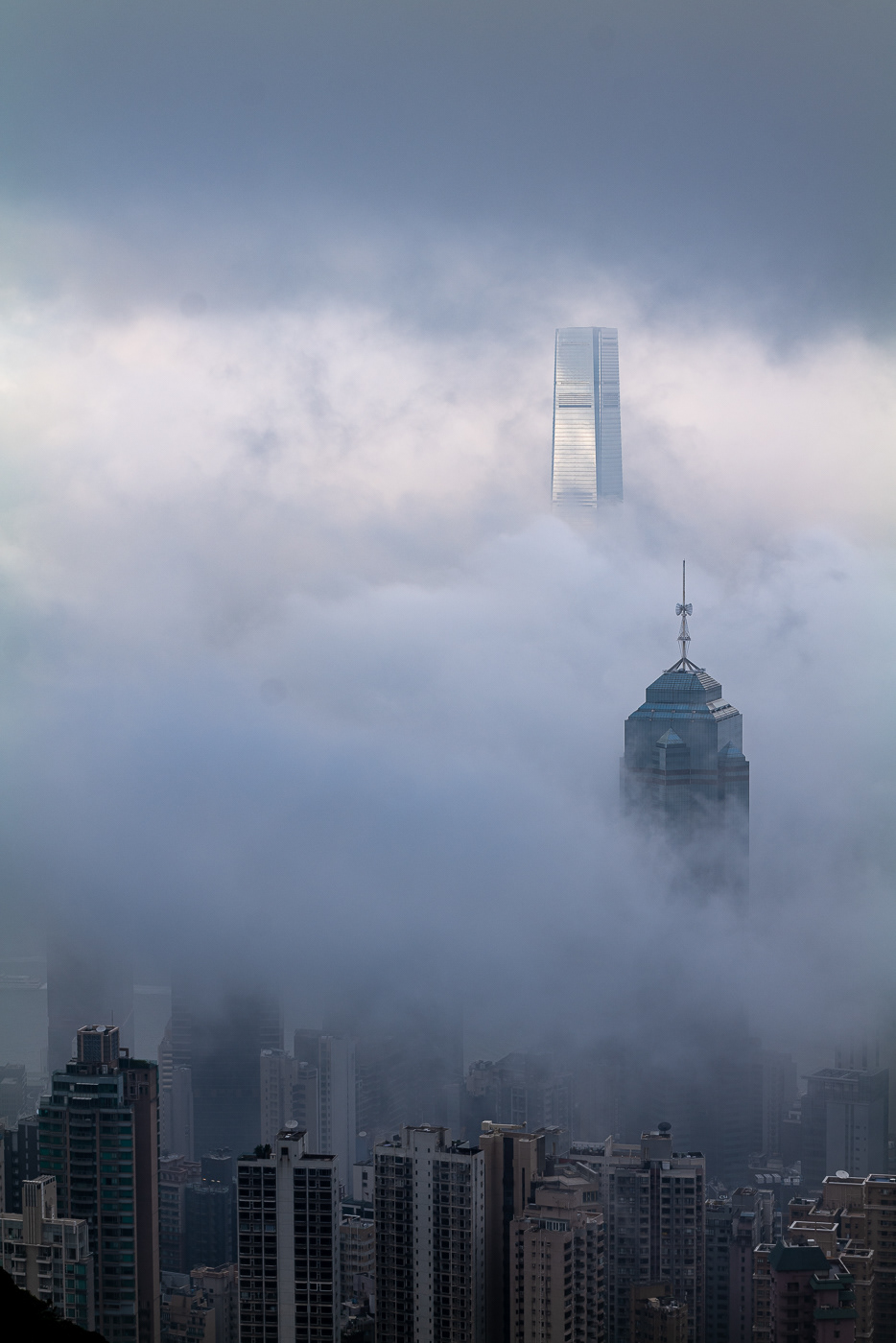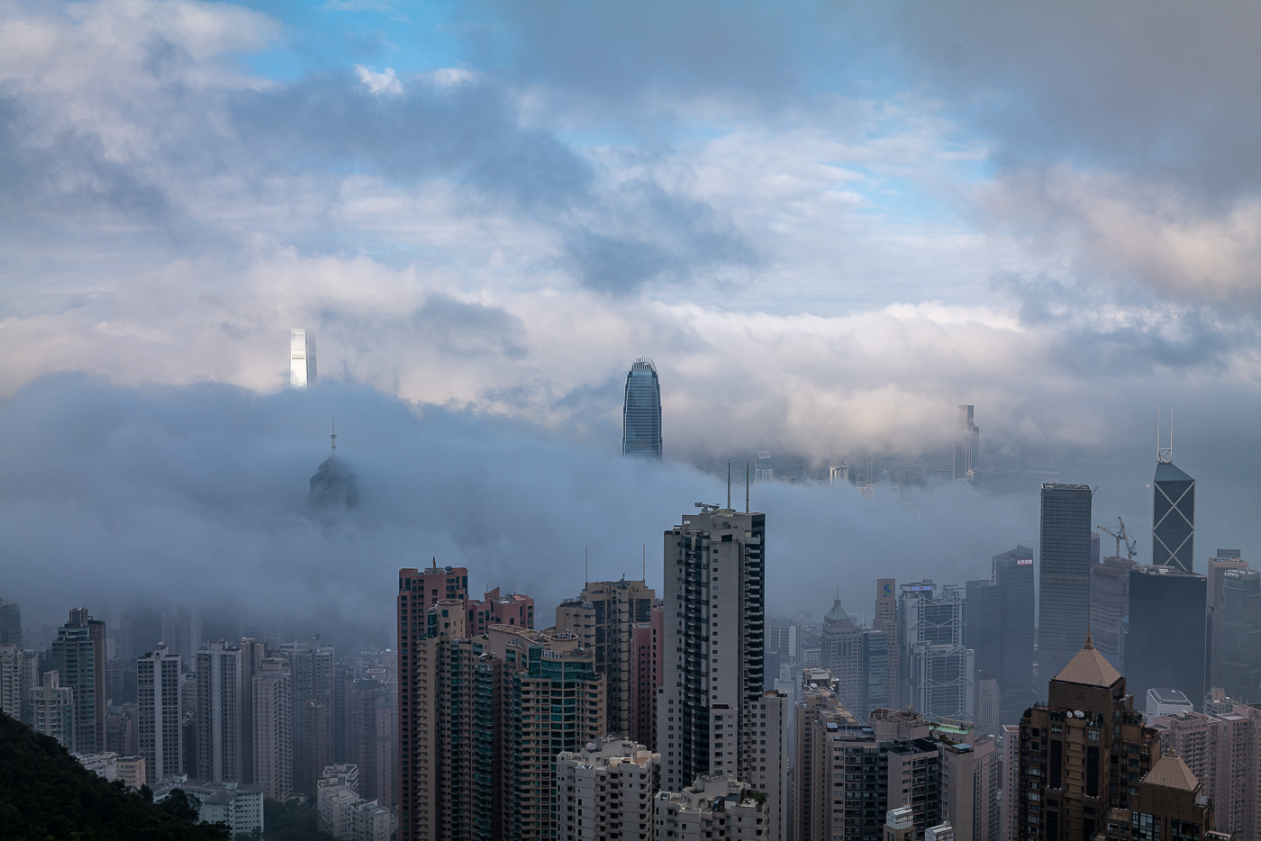 A thick layer of fog blanketed the harbour and cityscape on both sides in Victoria Harbour, Hong Kong in early February. A cool humid coastal airstream from the East raised humidity levels to 90% and brought in the fog, while weak sunlight and the surrounding hills prevented it from dissipating, covering the buildings during the day. This layer was below the observation point of around 500m altitude on Victoria Peak.