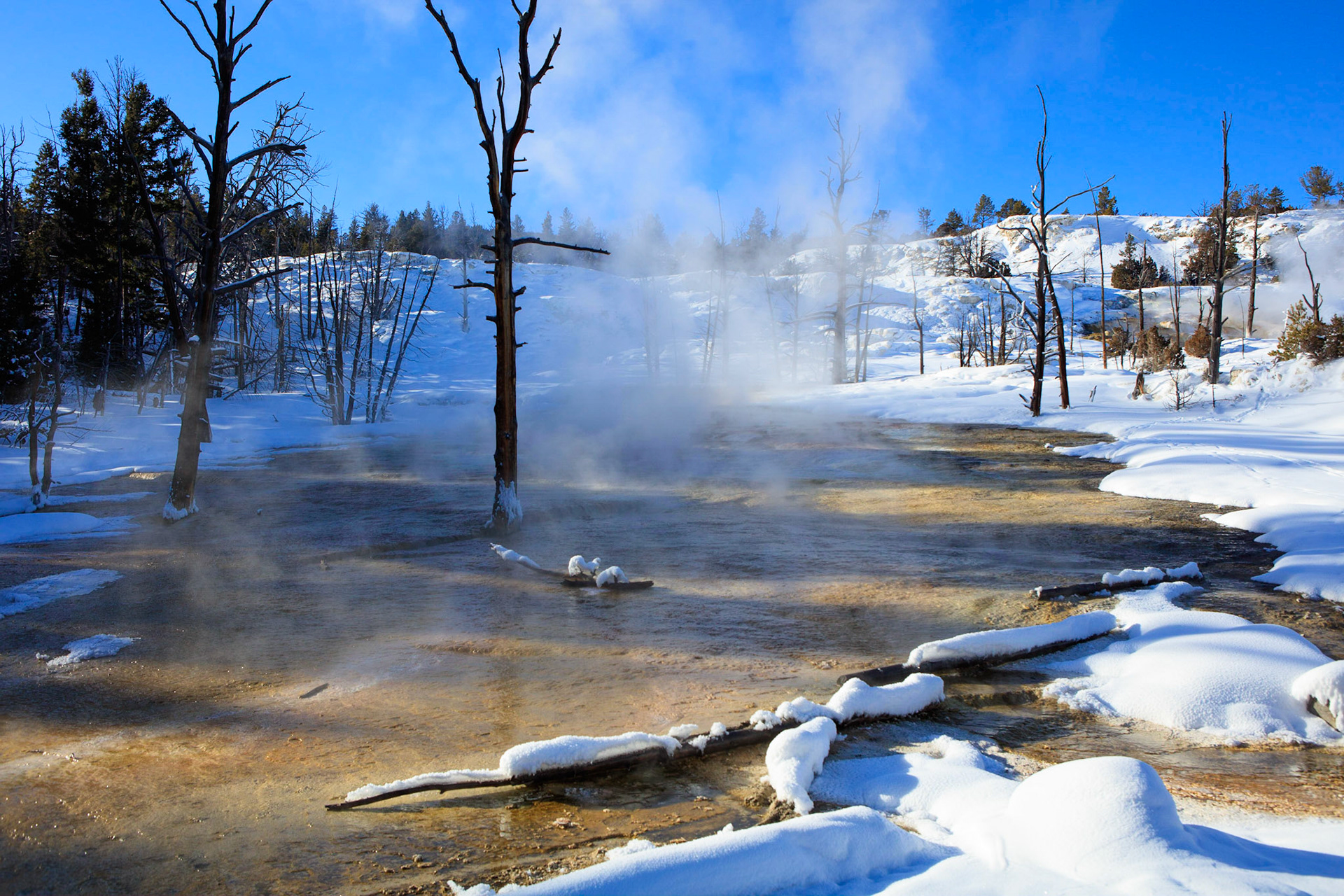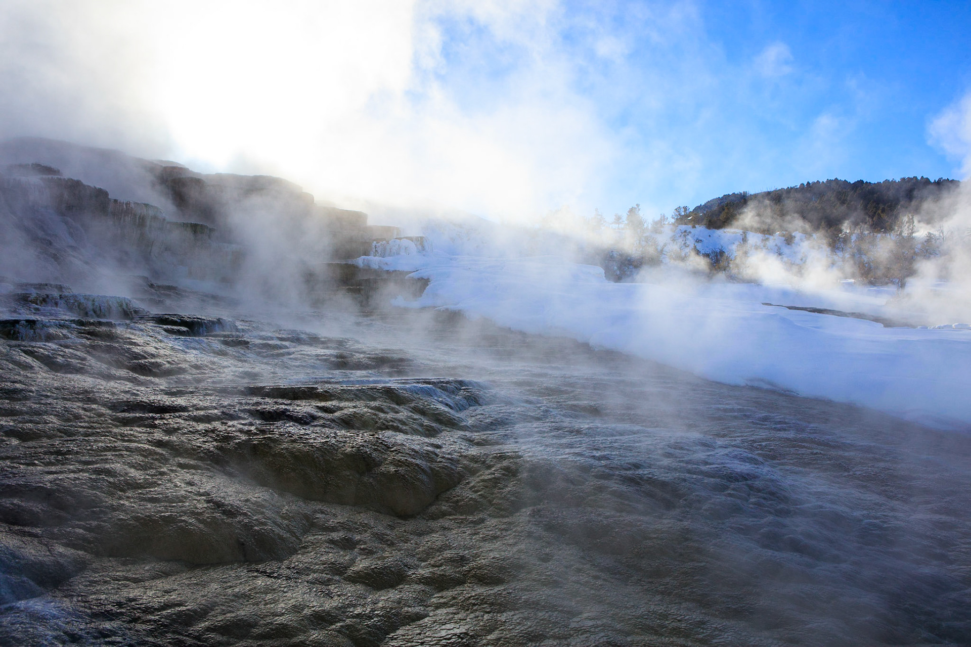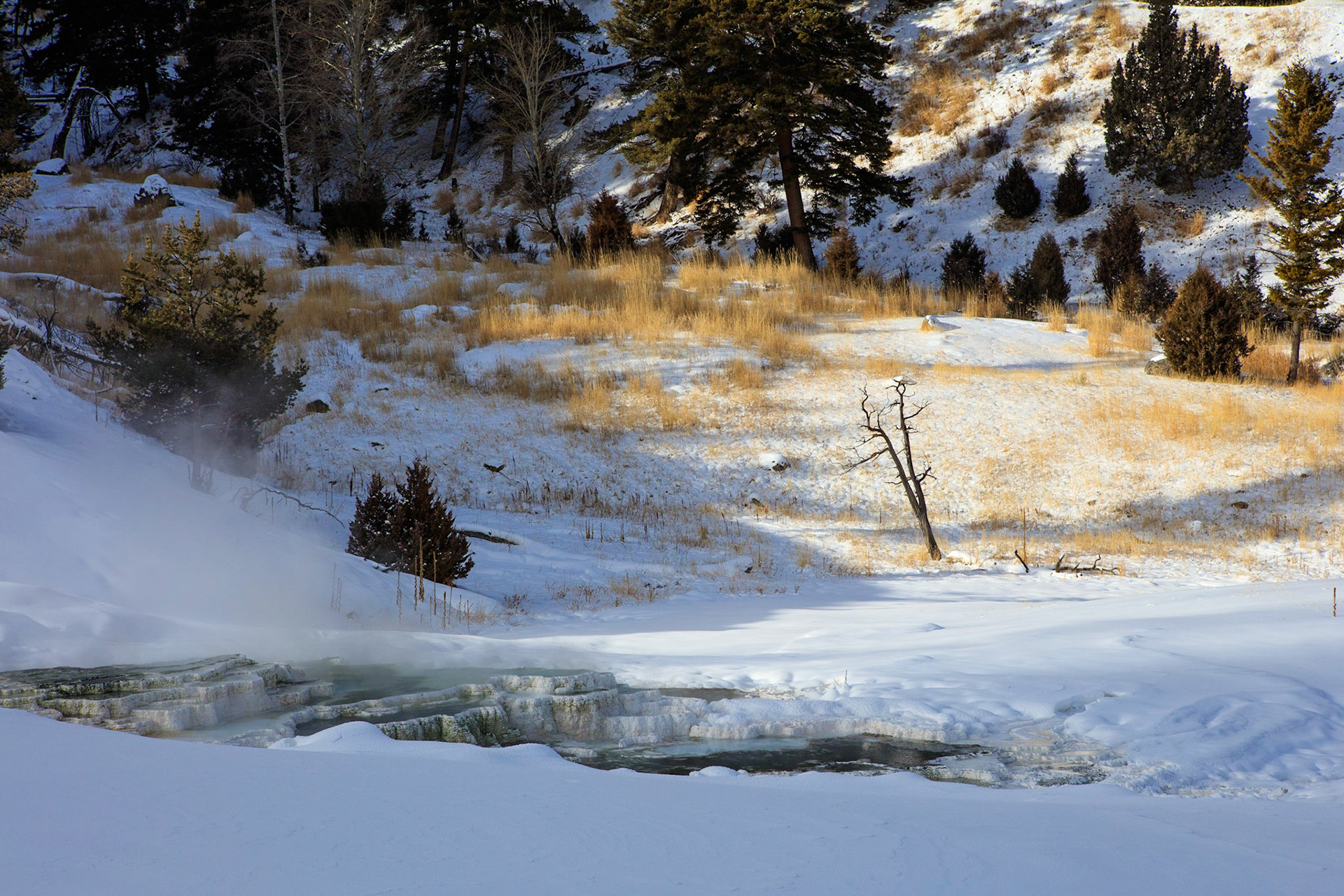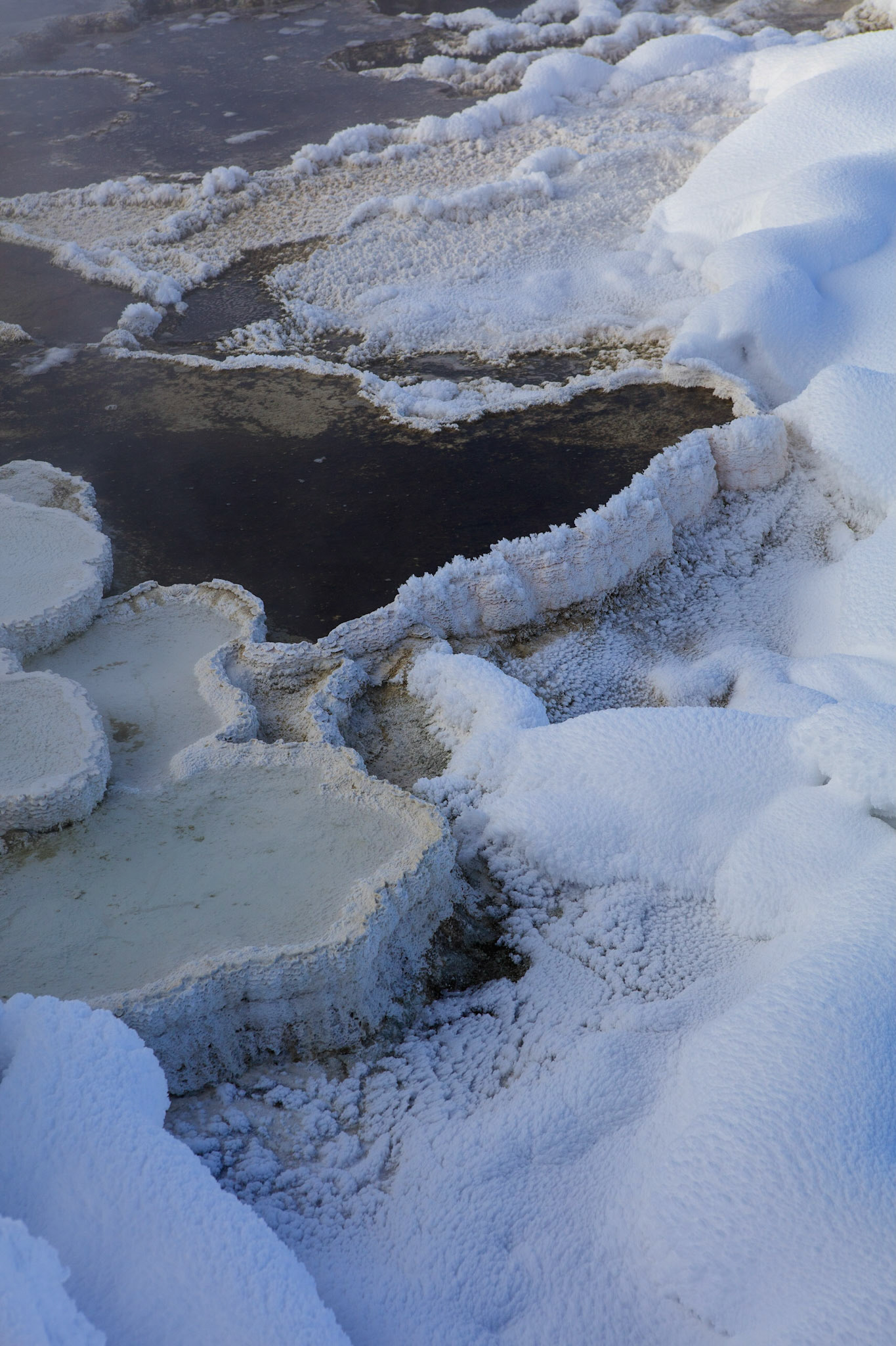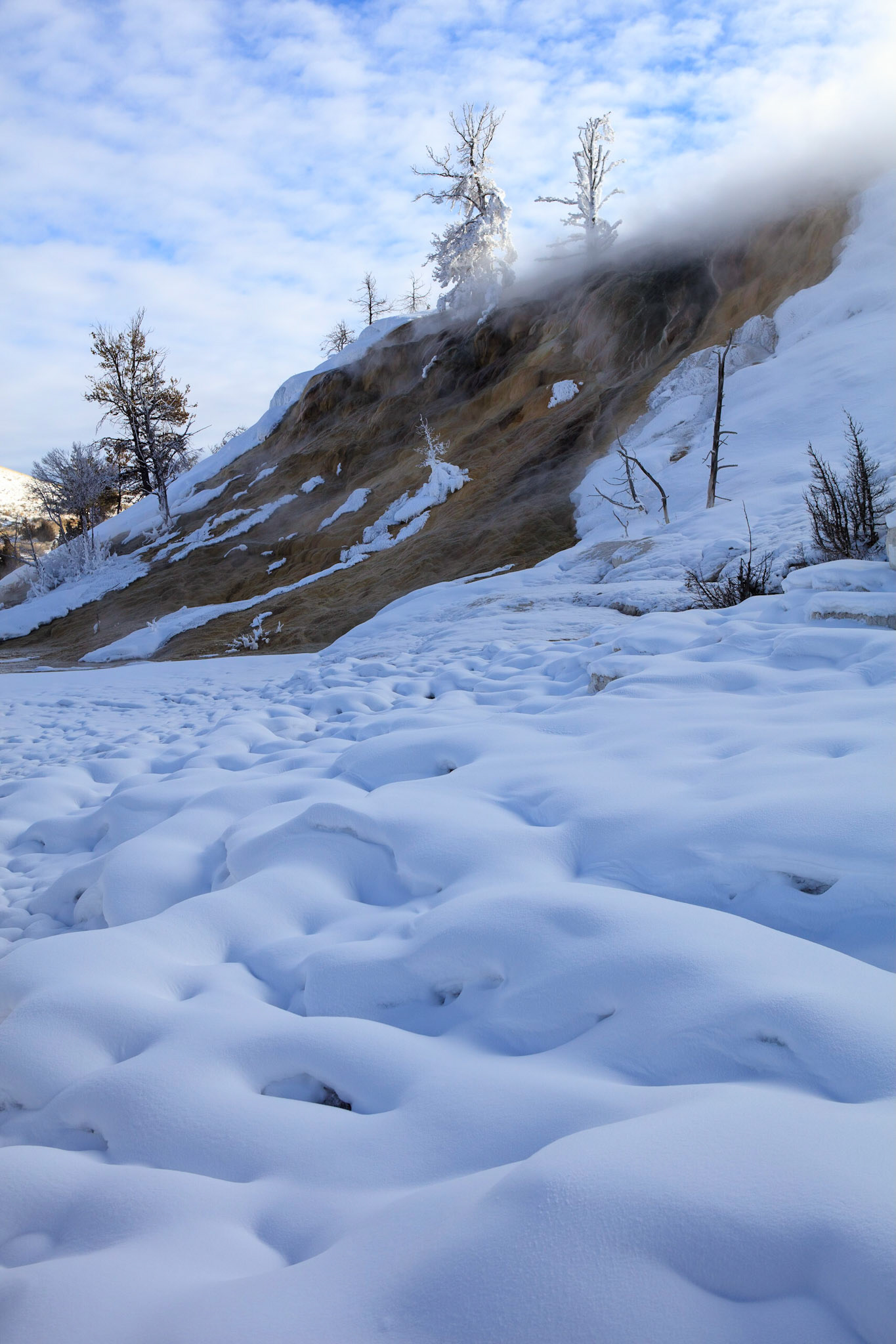 Mammoth Springs is not a spring but a large area consisting of many springs spread over 2 main basins, through which one can walk, snow-shoe, or cross-country ski. Palette terrace was just around the corner from the parking lot but immediately we were immersed in surreal scenery enhanced by tangential sunlight filtered through steam. At least one whole day is required to fully appreciate this place.