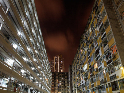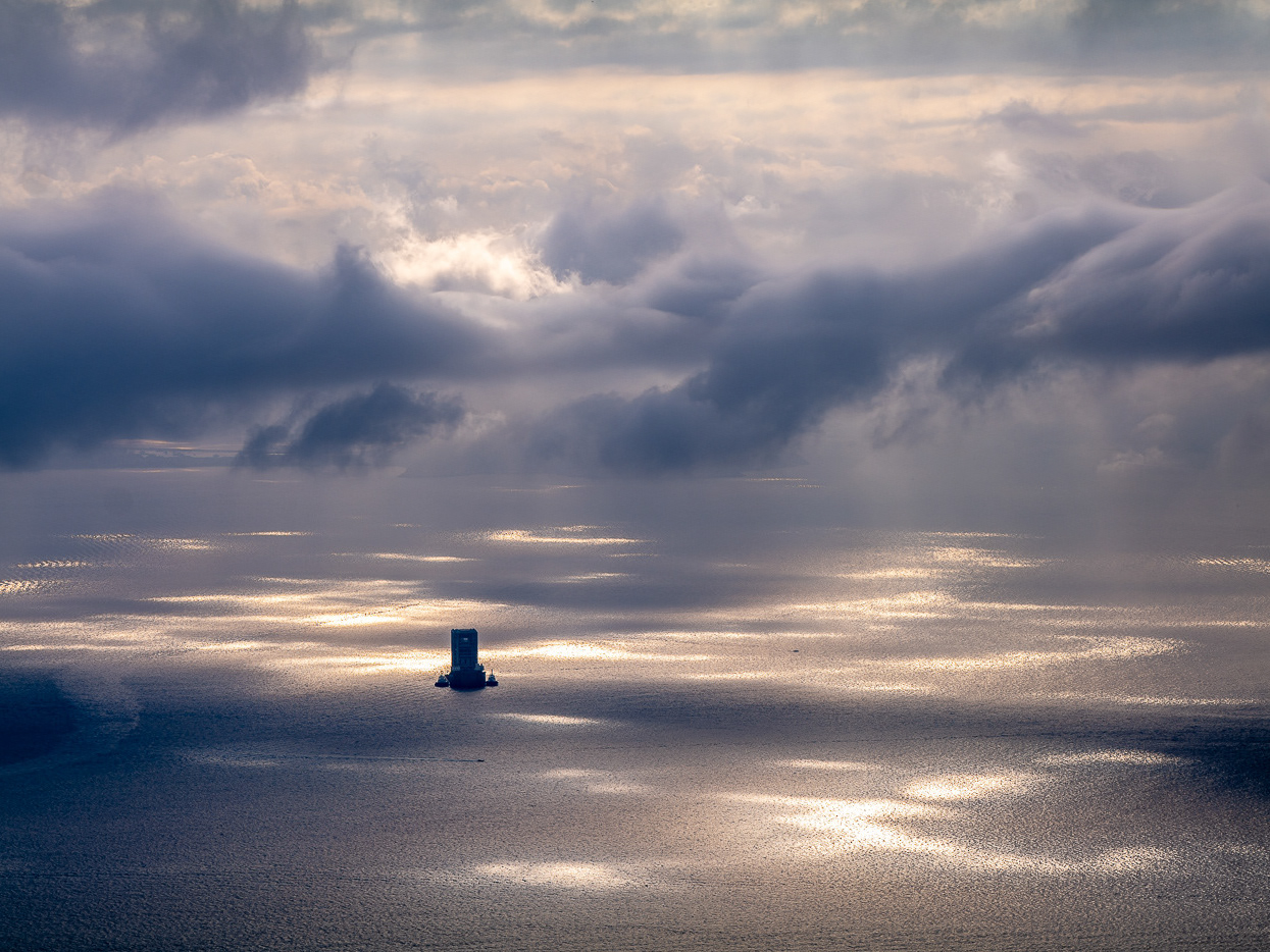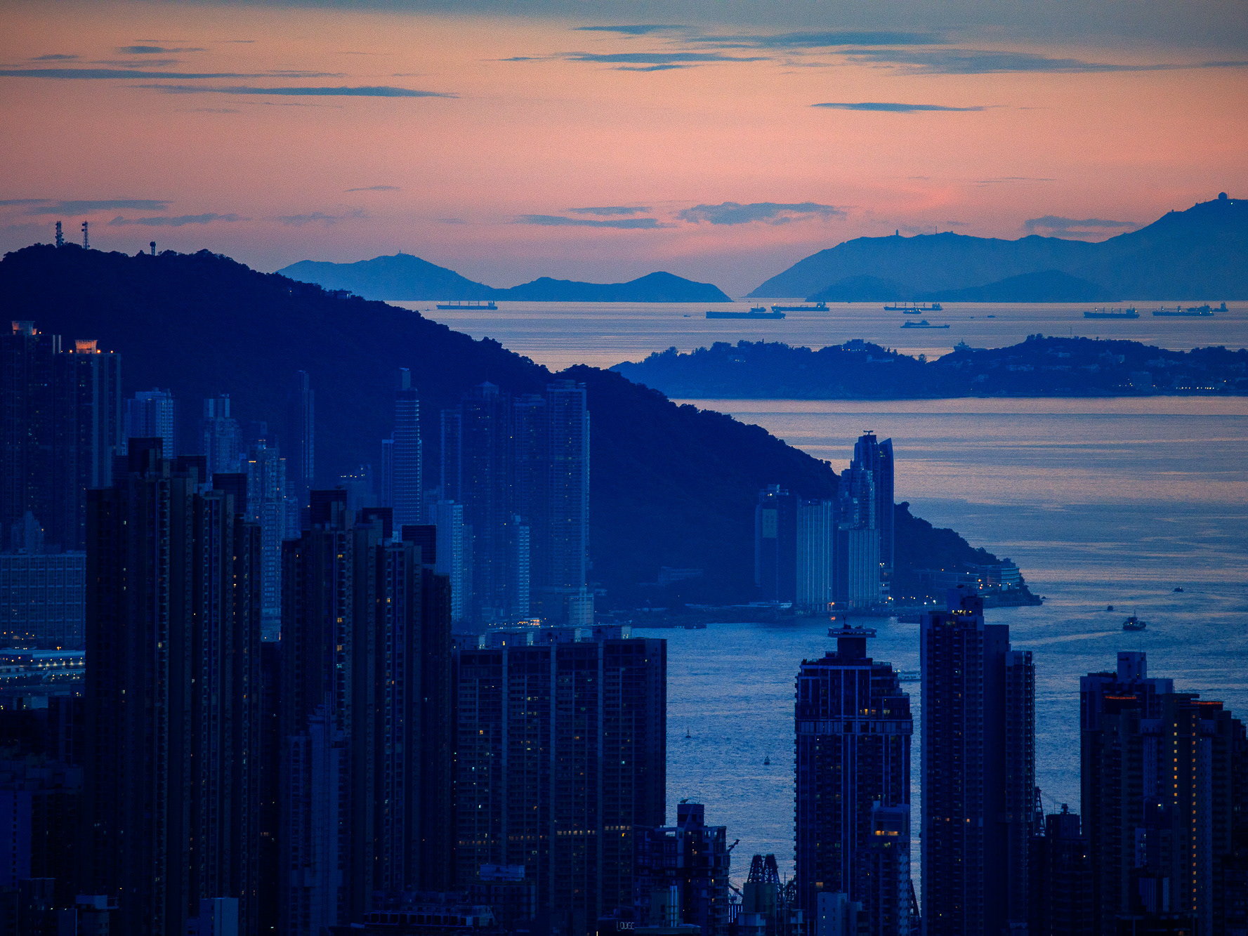 A foggy day with temperature inversion in the monsoon season of Hong Kong, viewing from Victoria Peak. Over the harbour was a sea of fog but on the other side of the island, a more interesting light show was at play.